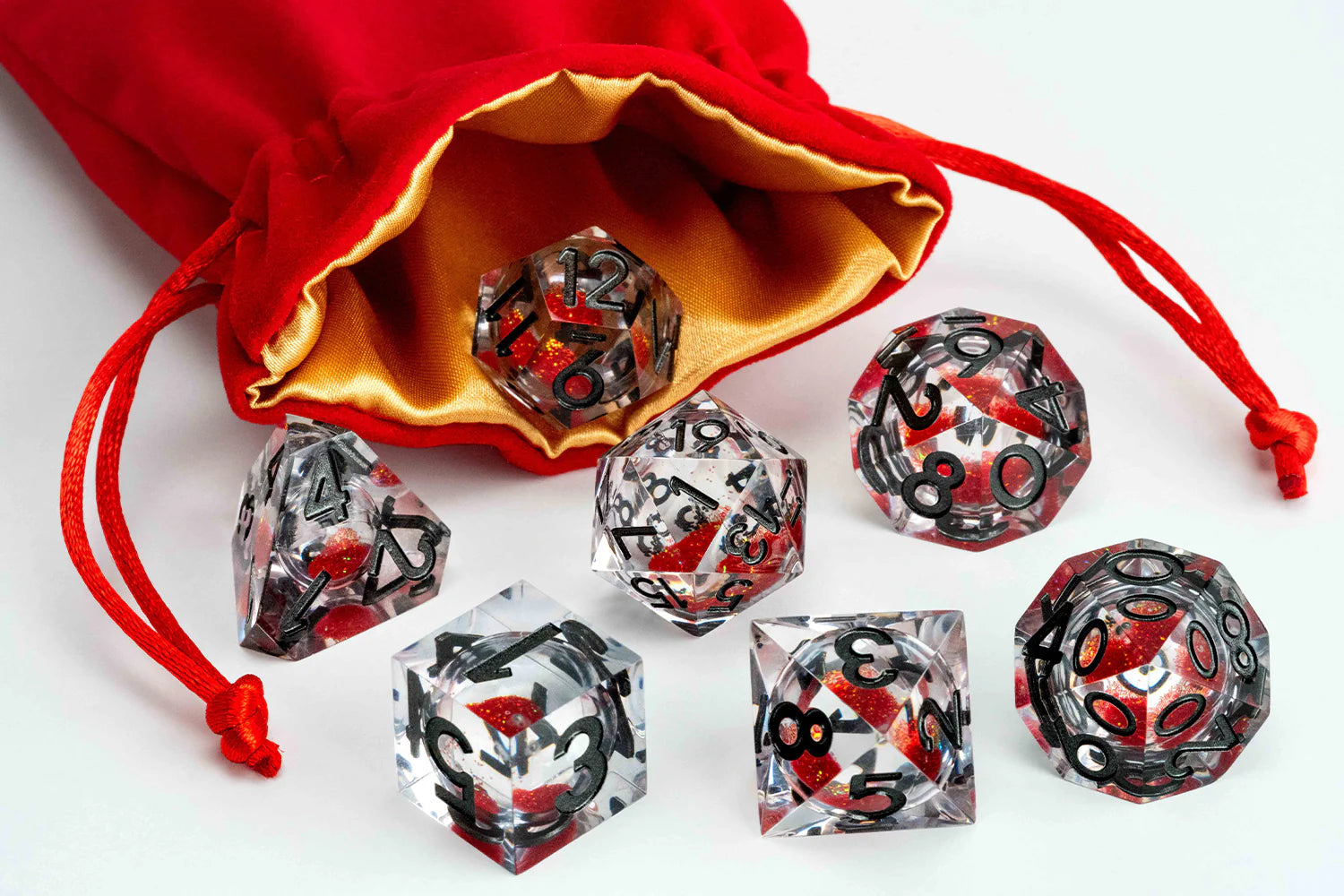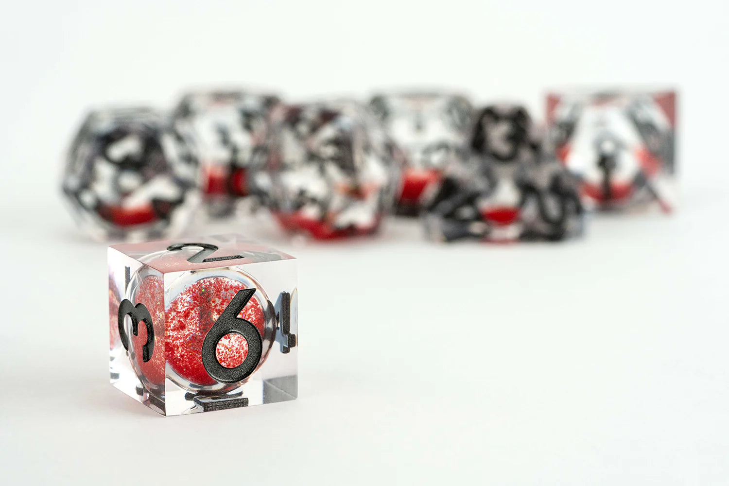 Liquid Core dice are hand-crafted and infused with glittery liquid cores that swirl when rolled. Each set is hand-polished to keep their beautiful sharp edges.